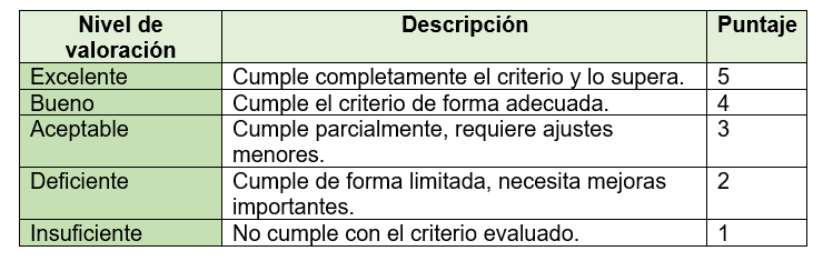Se emplea una escala cualitativa-cuantitativa de cinco niveles para cada criterio, lo que permite una valoración más precisa y adaptada a la naturaleza pedagógica del entorno: