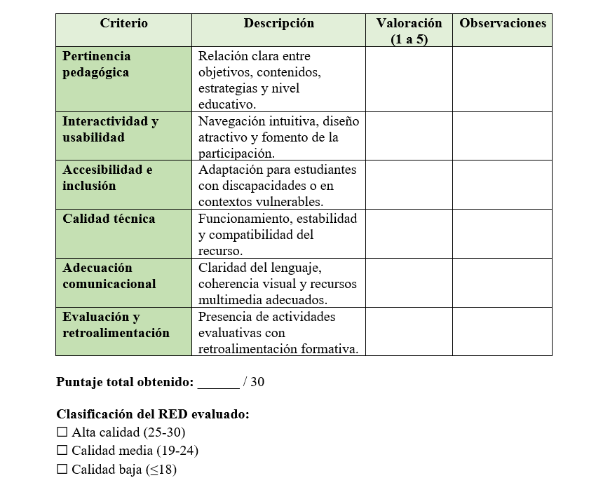 Aplicación de un instrumento estandarizado, diseñado con base en seis criterios fundamentales: pertinencia pedagógica, interactividad y usabilidad, accesibilidad e inclusión, calidad técnica, adecuación comunicacional y evaluación con retroalimentación. Este instrumento puede ser aplicado a una amplia variedad de RED, como aulas virtuales, objetos virtuales de aprendizaje, blogs educativos, plataformas interactivas, entre otros.
